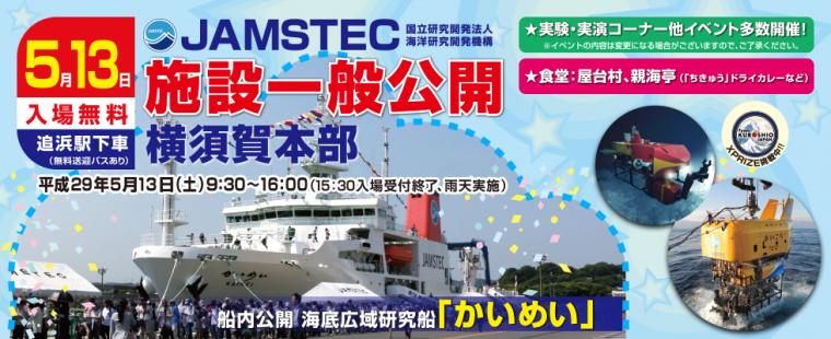おすすめ!JAMSTEC横須賀本部 施設一般公開日時:2017年5月13日(土)会場:JAMSTEC 横須賀本部海底広域研究船「かいめい」の公開、深海巡航探査機「うらしま」や他の深海探査機の実機展示! -
