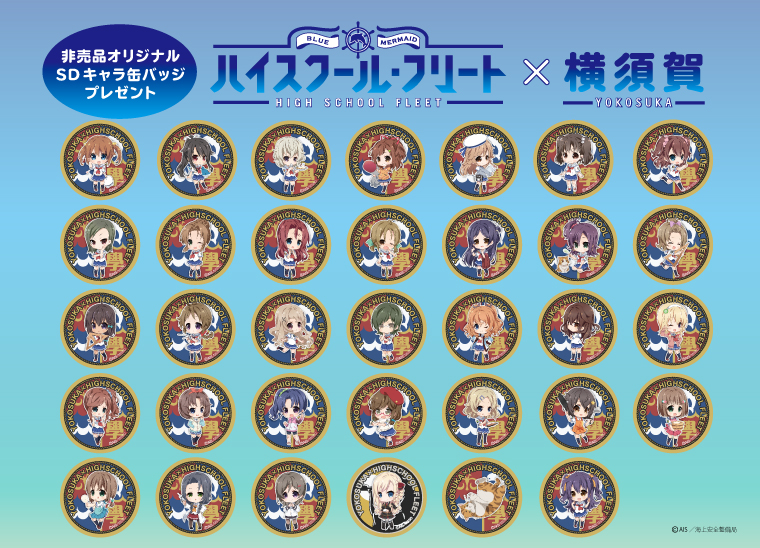「ハイスクール・フリート」SDキャラ缶バッジキャンペーン日時:7月15日(金)~なくなり次第終了会場:横須賀市内34店舗~アニメキャラの等身大パネル設置店へヨーソロー!~お買いものをして非売品のオリジナルSDキャラ缶バッジプレゼント!! -