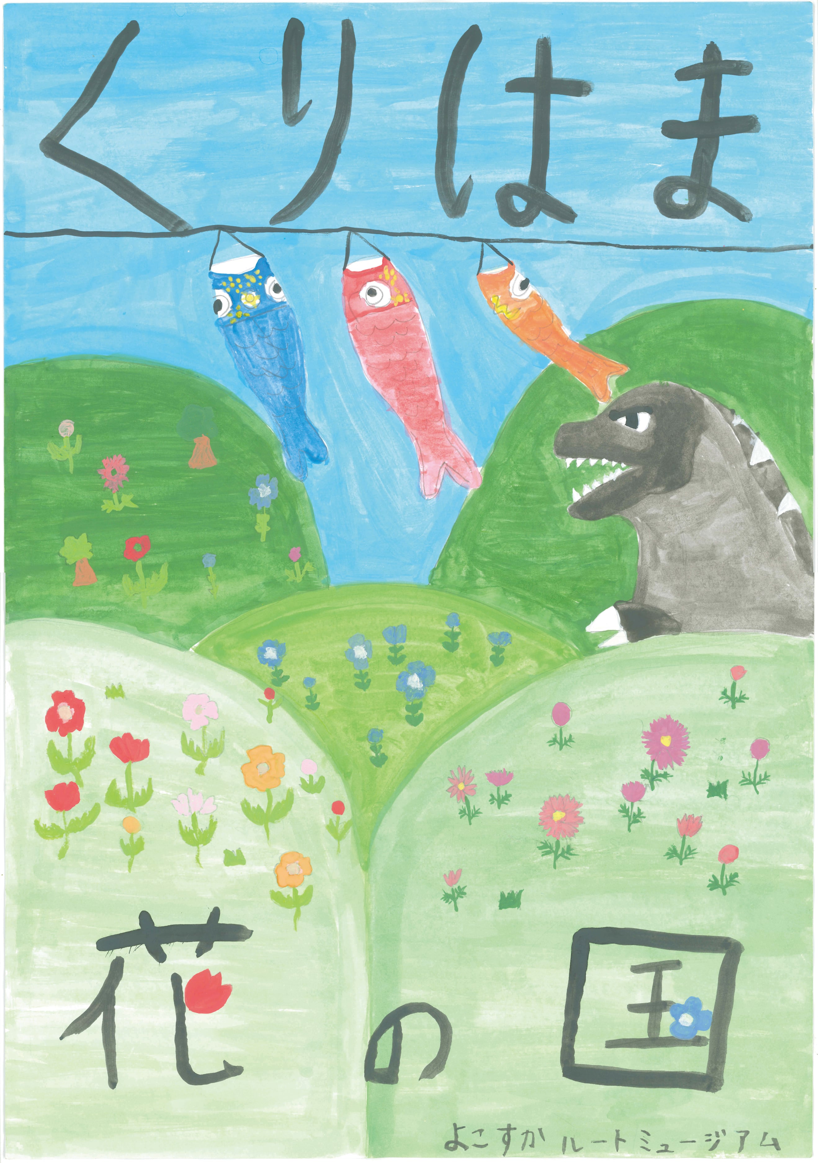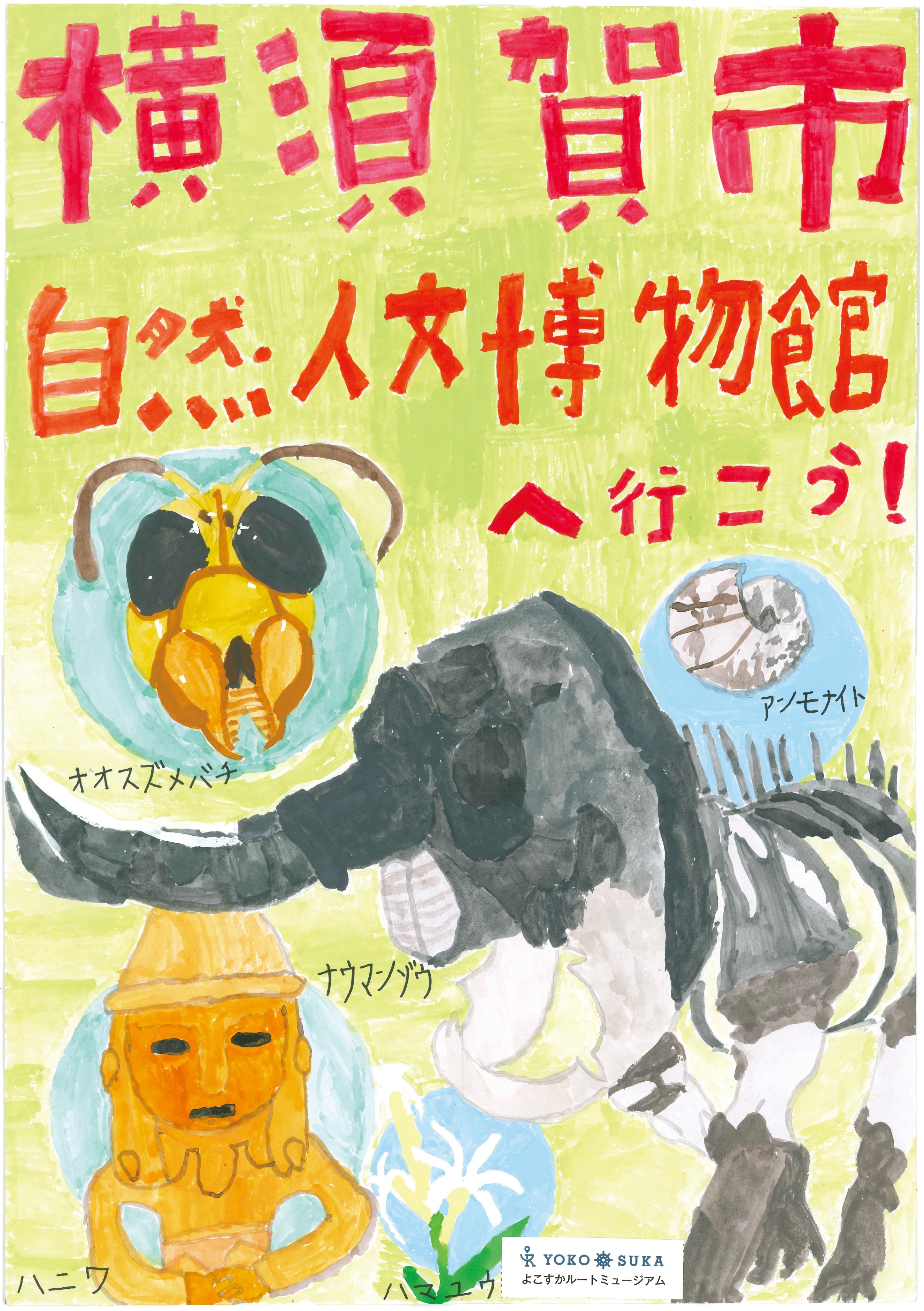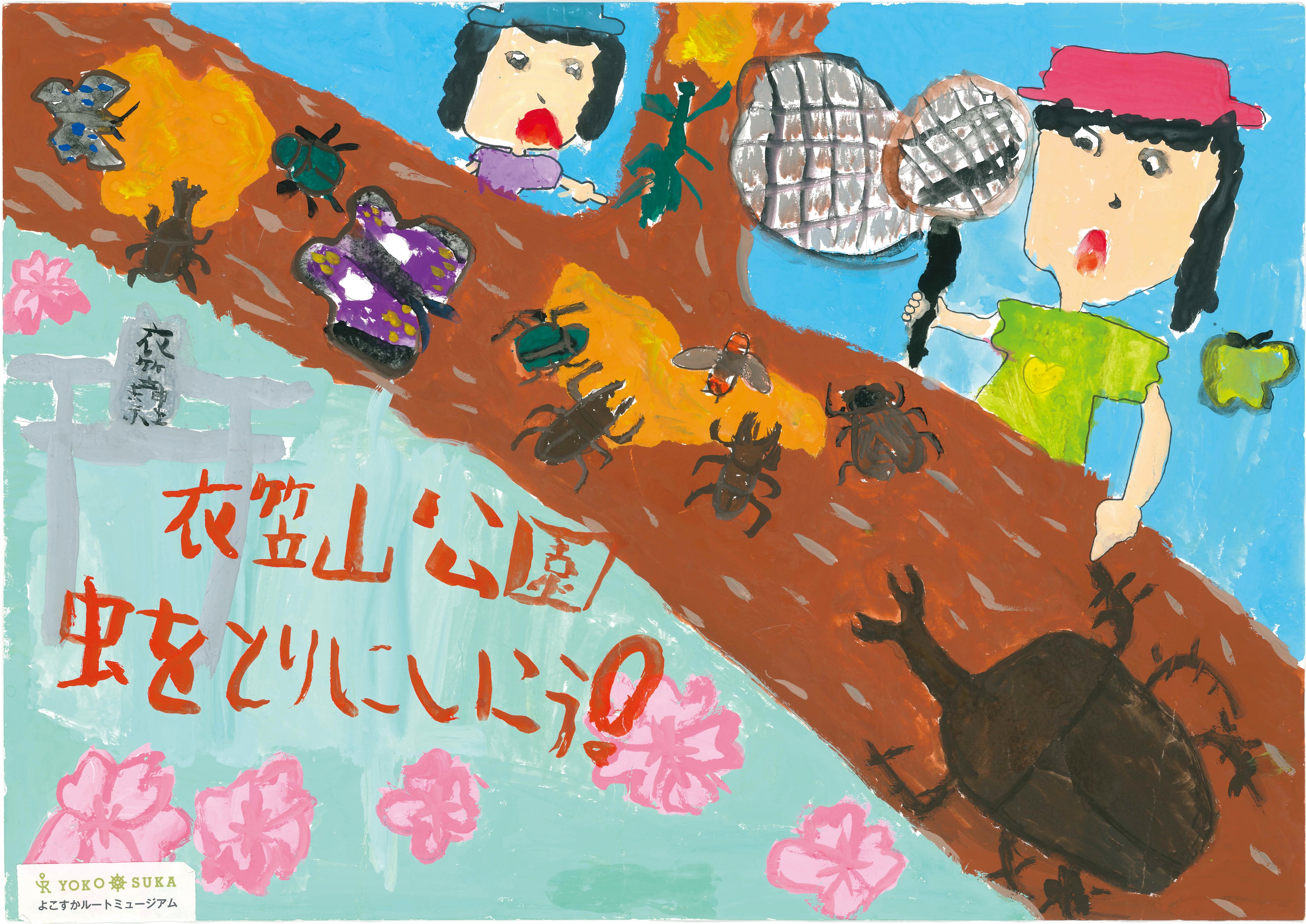 作者の絵は、画力の点ではストレートに子供らしい絵として、一見微笑ましい作品として捉えられるかもしれません、しかし、もし作者が誰かから絵を習わずにこの作品を仕上げたのなら、自分の力を最大限に活かし、モチーフや色を、一番にインパクトの放つ配置や配色で選択したということになります。子供たちが描く絵の勿体無い点として、好き・得意な部分だけに全力を注ぐ、というのがあります。もちろんそれはとても素敵なことですが、「あえて」ではなく「欠け」として見えてしまうと、全体のバランスが崩れてしまいます。本ポスターは、面倒だと思われる虫網にまで気を配って描かれているのが大変素晴らしいです。絵の「足し算と引き算」が上手なのでしょう。衣笠山公園で虫を見つけたり獲ったりする楽しさを、目一杯伝えたかったのだろうと思いました。人物の表情にも、見つけた時の驚きや、リアルな嬉しさがよく伝わります。
