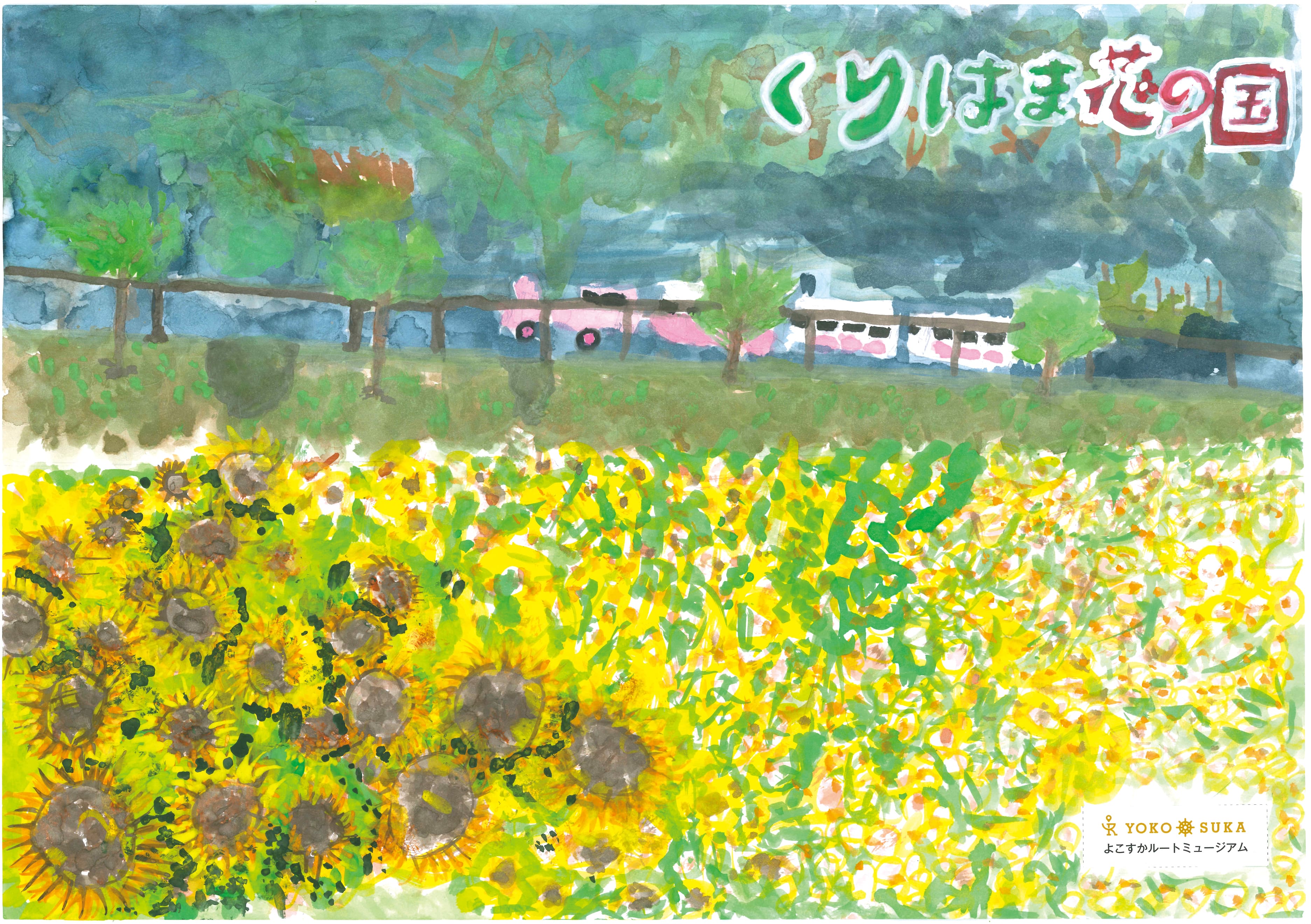 よほど作者が見た風景が美しかったのでしょう。しかし、自分が見て美しいと感じた状景をここまで美しく再現できるものでしょうか。印象派の画家達が見たら飛びつくような、「美しい」とはこの絵のためにあるような絵力を放っています。この絵を前にすれば、どのような言葉も霞むような気がしてなりません。(実際私のつづる全ての言葉が浅く思えませんか?)作者は、濃い、淡い黄色や、濁った青緑を巧に彩色しながら、印象派さながらの遠近法を巧に使用し、絵から外へじんわりと柔らかく広がっていきそうな、もはや絵画ではなく空間美術ともとれるような表現力で魅了しています。ポスターとして「つべこべ言わずにくりはま花の国に来なさいよ」と言われているような気持ちになりました。