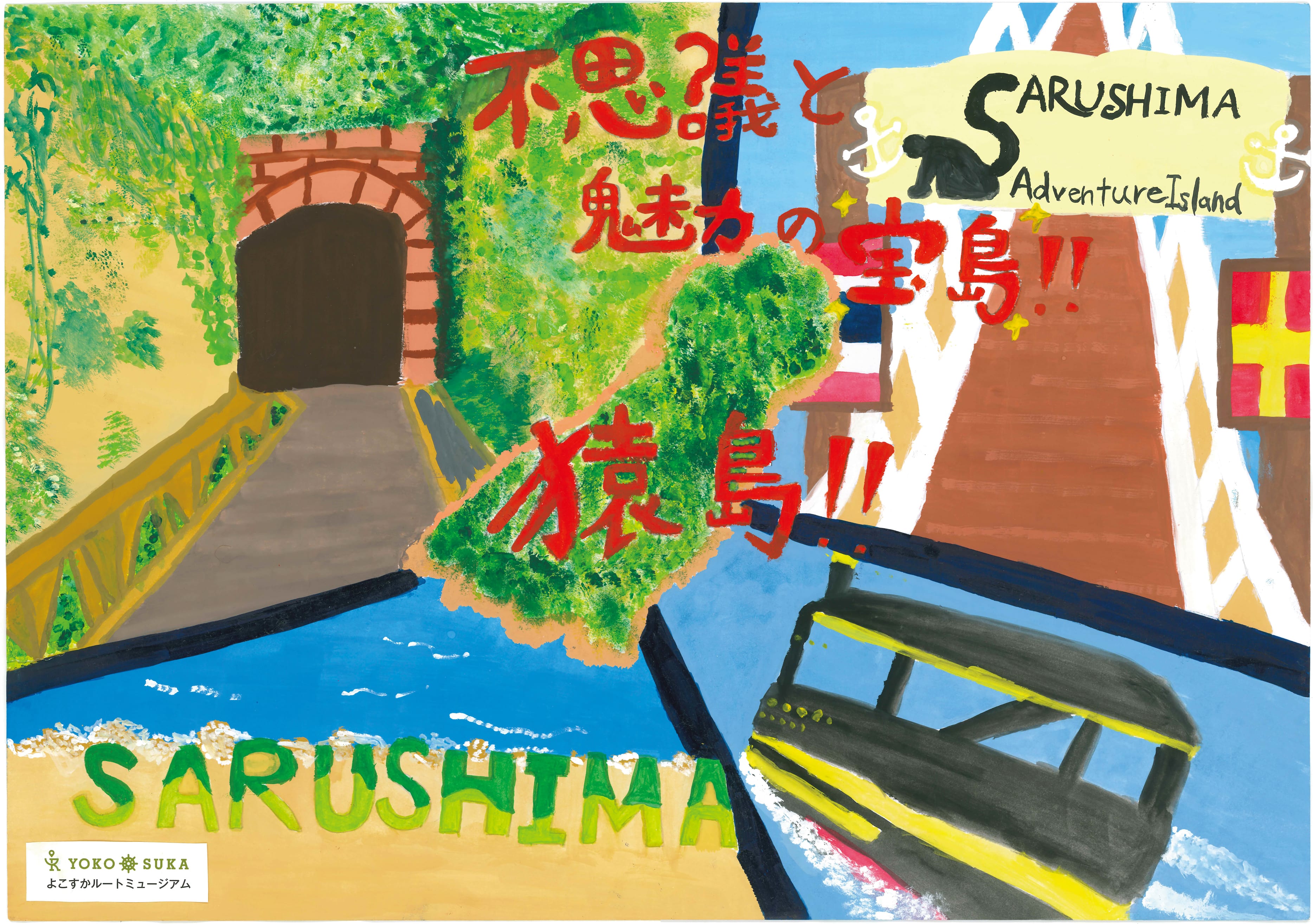 猿島は見せたい場所が沢山ありますから、絵としてどの場所を選択するかに頭を悩ませます。まず、選んだ場所の構図が決して単純ではなく、難しい構図に挑んでいる点に、勇気と自信と意気込みを感じます。私なら筆を放り投げるかもしれません。まず猿島を描くことを選ぶこと自体にエネルギーが必要です。しかし、作者は決して筆を投げずに、どうしたら綺麗に、それぞれの場所の風景を忠実に伝えられるかを沢山考えたのだろうと思いました。シンプルに描き上げていますが、特徴をしっかりと捉え、遠くからポスターを見ても猿島とわかります。観光客が実際に猿島を訪れれば、「絵で見た場所だ!」とすぐに気づくでしょう。それはデザインの分野において、とても重要な力です。